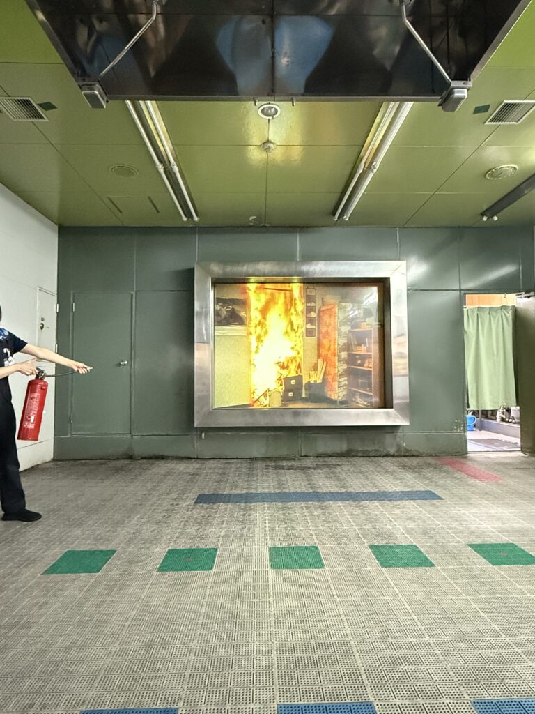 実際に水が入った消火器で消化活動が行えて