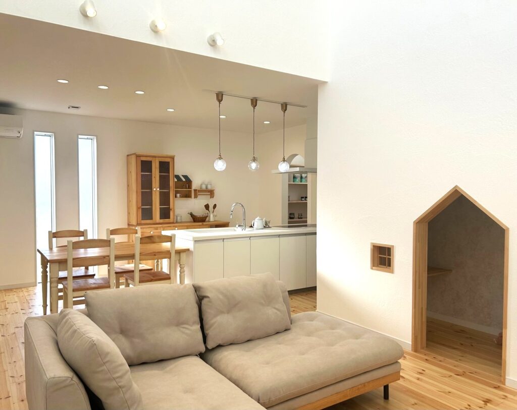 ソファも家具屋さんで!キッズスペースにはいる木枠付きのお家型下がり壁はポイントに!お隣には格子付きの窓も♡