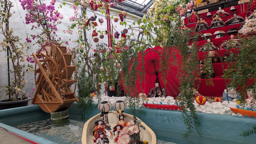 そのブーゲンビリアに囲まれて飾られている、お雛様たちや「さげもん」がおむかえしてくれました。