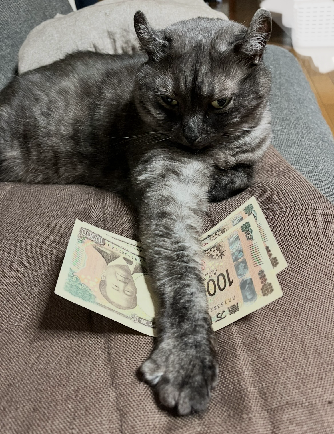 さて、タイトルの『猫に小判ならぬ、猫にお札』ですが、自宅で財布の整理をしていた時の事、ソファに置いたお金を、、、